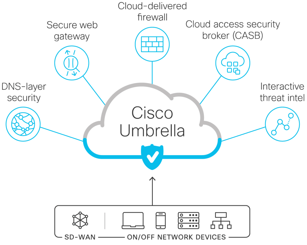 Cisco Umbrella is a cloud-delivered security platform that integrates multiple security functions, including DNS-layer security, secure web gateway, firewall, cloud access security broker (CASB), and threat intelligence solutions, into a single service.